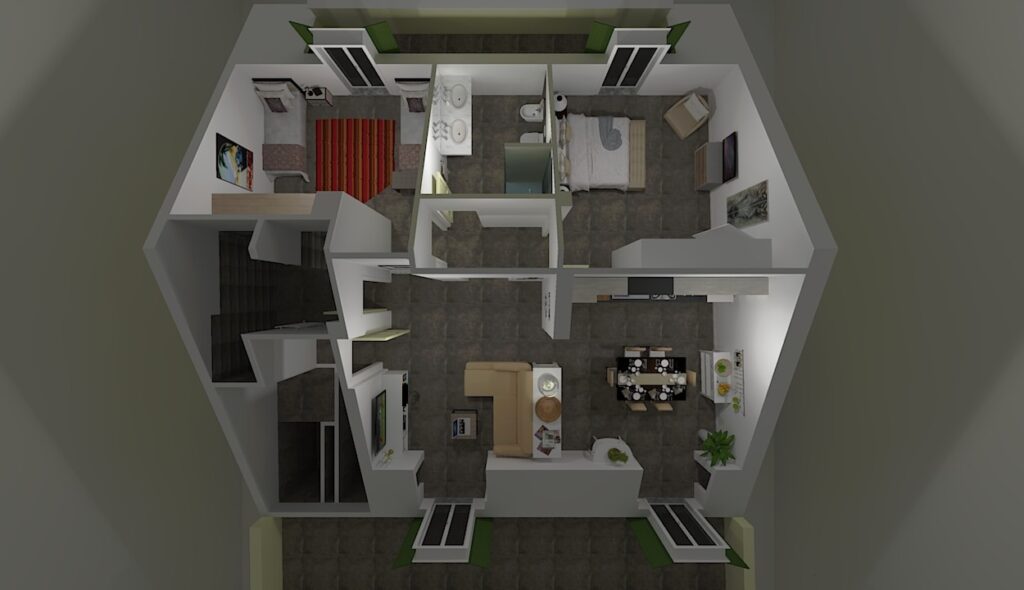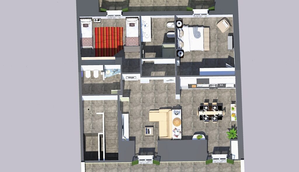 Il progetto prevede due camere matrimoniali con terrazzo dedicato, doppi servizi ed una piacevole zona giorno ben divisa tra sala da pranzo e living con affaccio su una terrazza vivibile di ampia metratura.